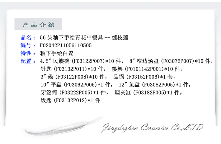 56頭青花手繪纏枝蓮中餐具