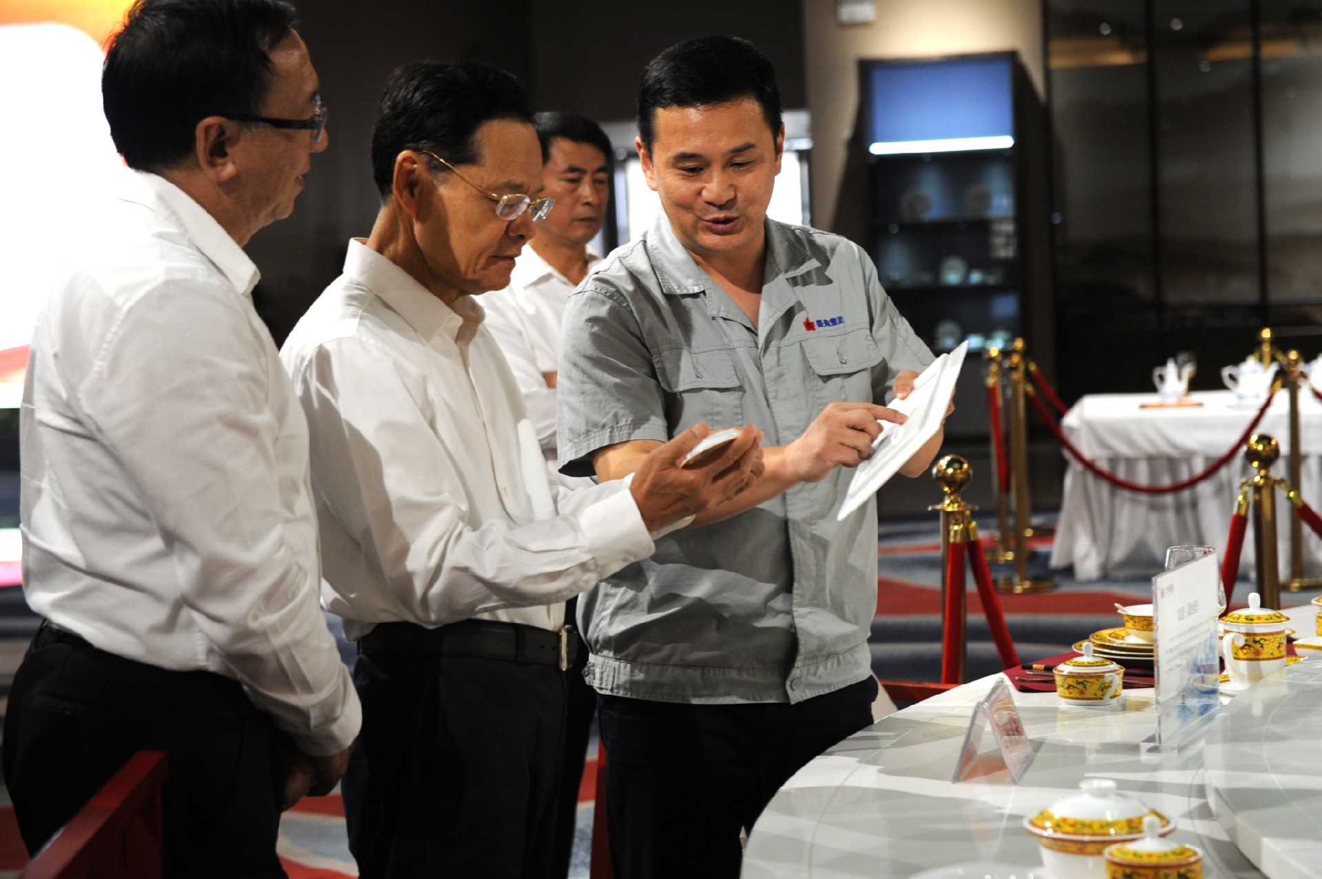 走進國瓷館,鄧景揚向陳武一行介紹了集團的基本情況,國瓷館展廳規(guī)模。鄧景揚介紹說,“國瓷館”是目前全世界最大的單一品牌陶瓷展廳。參觀時,陳武興致勃勃地拿起桌上的一套產品仔細端詳,鄧景揚適時介紹到:“這是我們新開發(fā)的一款產品,是一套組合餐具,該產品將日用陶瓷和藝術陶瓷巧妙結合,合起來是一個花瓶的造型。”“這個不錯,有創(chuàng)意!是紅葉品牌嗎?”陳武問道?!斑@是我們集團旗下一個“百花”品牌的產品?!彪S即,鄧景揚向陳武介紹了景陶集團發(fā)展脈絡和以“國瓷紅葉”為主打品牌,金品陶、百花、家好系統(tǒng)品牌特色,集聚綻放的特點。期間,鄧景揚講述了“紅葉”與“御窯”前世今生的關系和如何將“紅葉”產業(yè)和陶瓷文化進一步做大做強制定的新的發(fā)展愿景。鄧景揚介紹道,“我們集團的發(fā)展愿景是做世界上最精美的瓷器,創(chuàng)百年一流企業(yè),讓‘紅葉’成為世界知名的日用陶瓷中國民族品牌,用陶瓷講好中國故事,展中華文化風采,讓‘紅葉’成為中華文化走向世界的文明使者?!标愇渎牶蟊硎臼终J可和贊同,并勉勵景陶集團進一步發(fā)揮好景德鎮(zhèn)陶瓷龍頭企業(yè)的帶頭作用,讓紅葉陶瓷真正走出去。