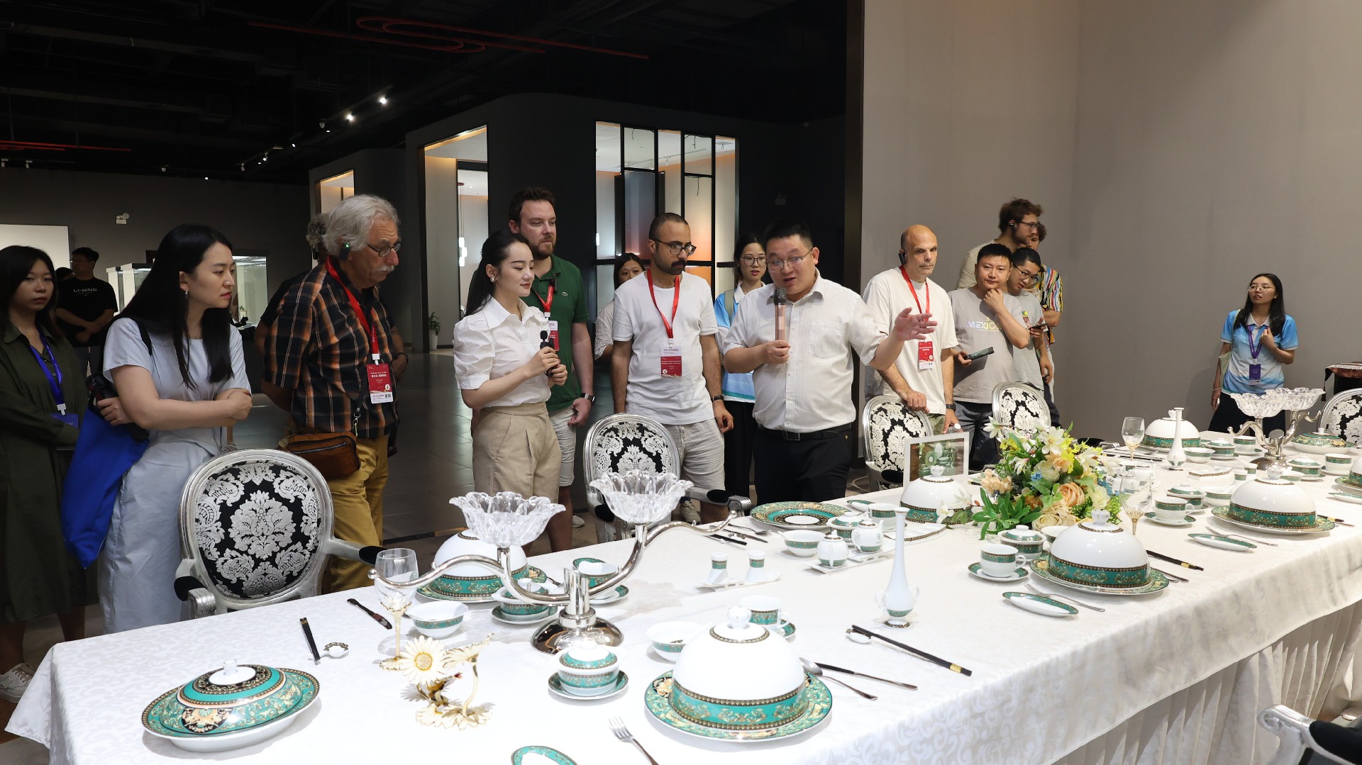在國瓷館二樓的國宴瓷展區(qū),采風團成員跟隨講解,饒有興致地聆聽國宴用瓷背后的經(jīng)典故事,深入了解紅葉陶瓷的發(fā)展歷程。行至專為宴請外國元首設計的瀛臺《如意》系列國宴瓷前,其精美的紋飾、獨特的器型立刻吸引了眾人的目光,記者們頻頻點頭贊嘆,紛紛舉起相機記錄留念。面對上海APEC會議用瓷,采風記者盛贊其為中西方文化完美融合的典范,是文明交流互鑒的璀璨結(jié)晶。在青花玲瓏雙蕾花系列展臺前,記者們細細品味著瓷器靈動的線條與別致的造型,對如何燒制出寶石般晶瑩剔透的玲瓏工藝充滿好奇。王小勤副總經(jīng)理對此進行了詳實專業(yè)的解答,令各國記者深感意猶未盡,駐足良久。